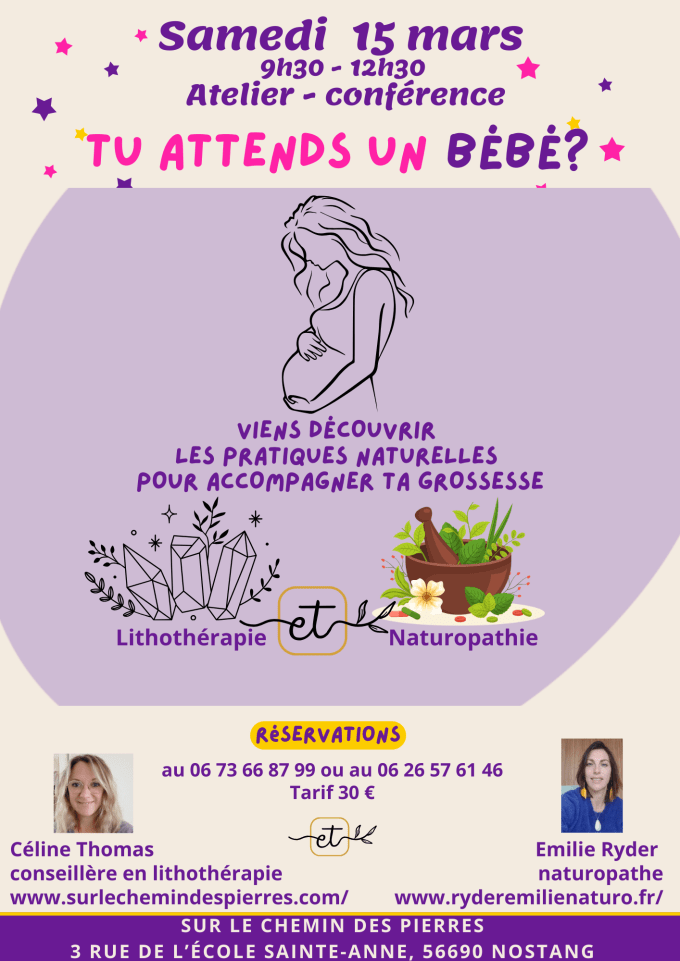 Pour les futures mamans, j’invite une naturopathe au cabinet pour vous proposer un atelier conférence à deux voies/voix pour vous faire découvrir les pratiques naturelles qui peuvent accompagner votre future grossesse.