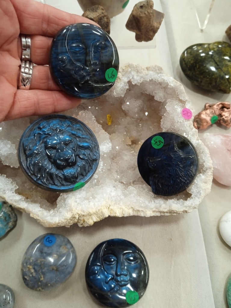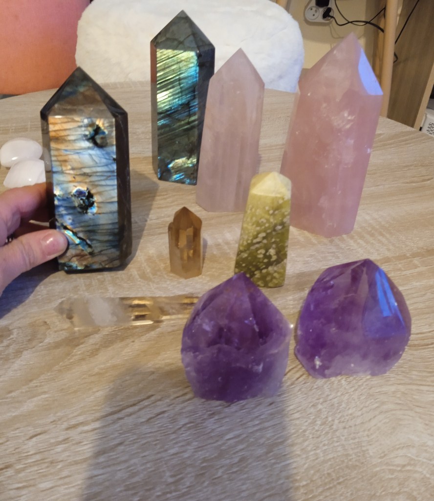 Labradorites, citrines naturelles, Améthystes, Quartz roses, Serpentine, Spinel noir, Moldavite, Péridot, Bâtons de massage en cristal de roche…![]()